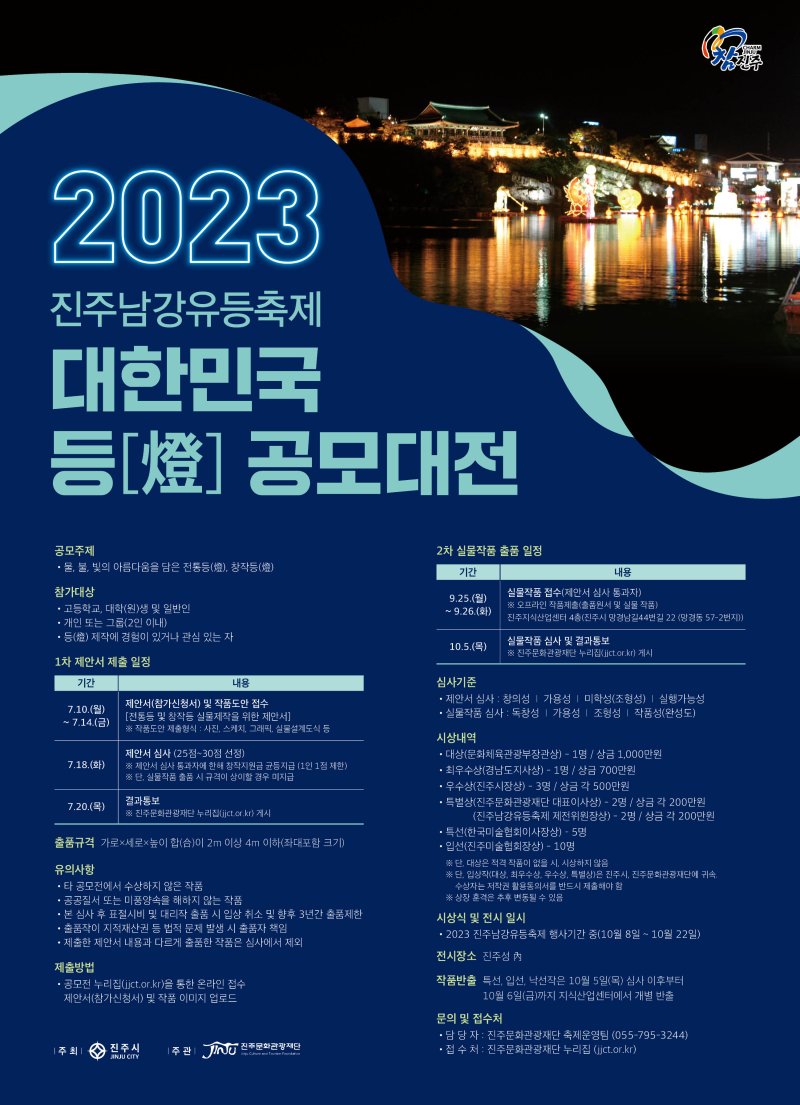 [진주=뉴시스] 정경규 기자 = 경남 진주시는 (재)진주문화관광재단이 주관하는 '2023 진주남강유등축제 대한민국 등(燈)공모대전'이 '물·불·빛의 아름다움을 담은 전통등(燈)과 창작등(燈)'이라는 주제로 개최된다고 20일 밝혔다.