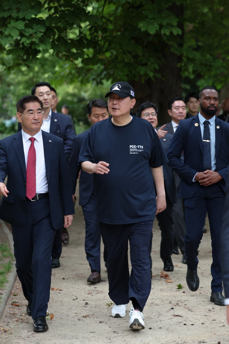 [서울=뉴시스] 양소리 기자 = 대통령실은 윤석열 대통령이 20일(현지시간) 프랑스의 한 공원을 산책하는 사진을 공개했다. 윤 대통령은 천안함 로고를 새긴 티셔츠와 모자를 쓴 모습이다.