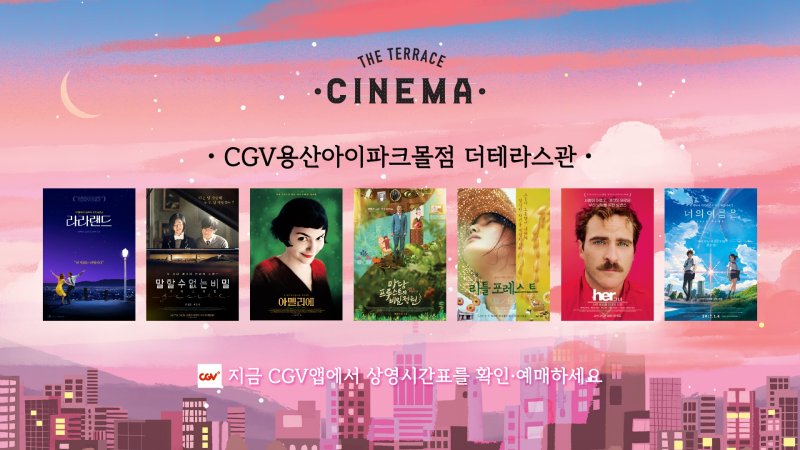 상영 영화는 해외 여행지의 분위기를 그대로 느낄 수 있는 '아멜리에', '그녀(HER)', '라라랜드', '마담 프루스트의 비밀정원', '너의 이름은', '리틀포레스트: 여름과 가을' 등이고, 'CGV용산아이파크몰 4F 더 테라스관'으로 CGV 홈페이지 또는 모바일 앱에서 상영 시간 확인 및 예매·구매 가능하다.