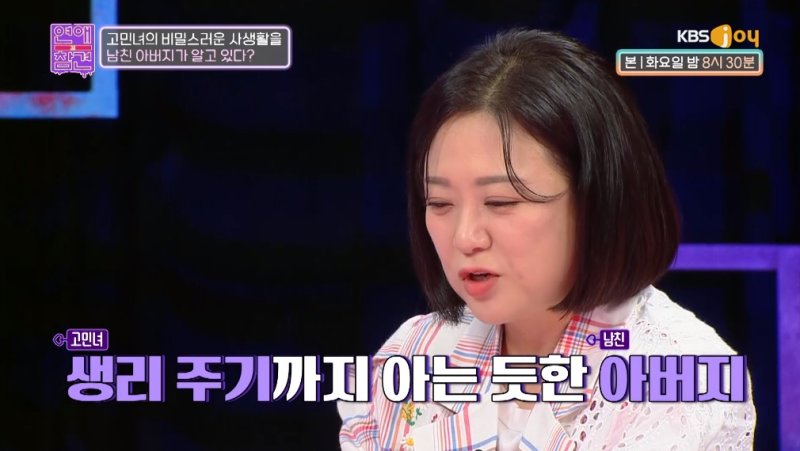 고민녀는 "생리 주기를 아는 듯 말하는 아버지의 말에 정말 민망했다"고 고백했다. 남자친구에게 "내 생리까지 말했냐"고 따지자, 남자친구는 "여자 몸에 좋은 걸 챙겨가니까 아빠가 물어 보더라, 저번 대추차도 아버지가 끓여주신 것"이라고 말해 충격을 안겼다.