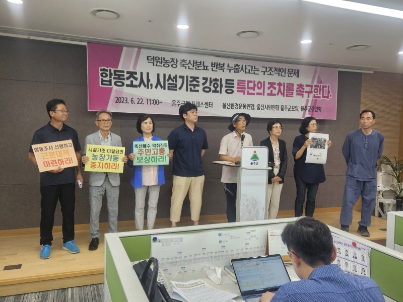 [울산=뉴시스]유재형 기자 = 울산환경운동연합이 최근 울산 울주군 언양읍 다계리의 한 농장에서 축산 분뇨 누출사고가 난 것과 관련해 기자회견을 열고, 농장 운영 중단 등의 특단의 조치가 필요하다고 22일 밝혔다.