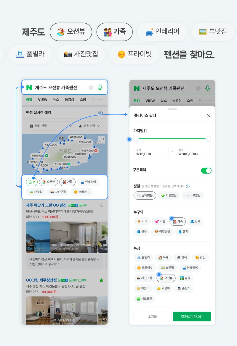 ‘플레이스 필터’ 기능을 강화해 검색 편의성도 높였다. 리뷰 콘텐츠뿐만 아니라 숙박 트렌드 등을 복합적으로 분석함으로써, 숙소의 대표적인 특징을 잘 담아내면서도 이용자들의 검색 니즈를 충족할 수 있는 필터 키워드를 구성했다. ▲특징 ▲분위기 ▲시설·서비스 등 세분화된 카테고리에서 필터를 선택해, ‘조식이 제공되는 반려동물 동반 풀빌라’, ‘럭셔리 감성의 수영장 있는 글램핑장’ 등 조건에 맞는 숙소를 손쉽게 모아볼 수 있다.