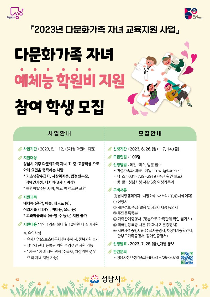 희망자는 성남시 홈페이지(시정소식→새소식)에 있는 ‘다문화가족 자녀 교육지원사업’ 신청서와 주민등록등본, 외국인등록증 사본을 시청 여성가족과로 이메일이나 팩스로 보내면 된다. 여성가족과를 방문해 신청해도 된다.