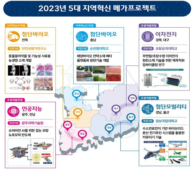 5개 지역혁신 메가프로젝트 사업단은 포항공과대학을 중심으로 하는 대구·경북 사업단이 이차전지, 울산·경남 첨단모빌리티, 광주·전남 AI, 충남과 전북이 각각 첨단바이오 R&D 사업을 추진한다.