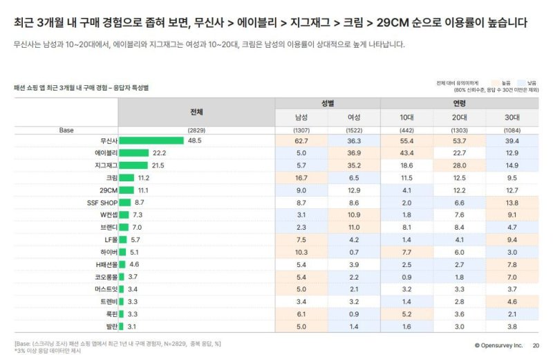 소비자 데이터 플랫폼 오픈서베이가 4월 공개한 'MZ세대 패션 앱 트렌드 리포트 2023'에서도 최근 3개월 이내 구매 경험 기준으로 무신사의 이용률은 48.5%로 1위를 차지했다.