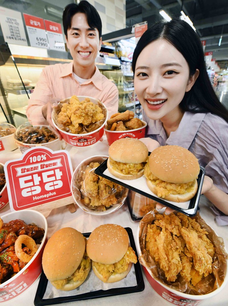 [서울=뉴시스]박미선 기자 = 지속적인 외식물가 상승에 홈플러스가 29일부터 신메뉴 '당당 순살치킨 트윈버거(4990원·2입)'와 '당당 후라이드 순살치킨(7990원)'을 출시한다고 27일 밝혔다.