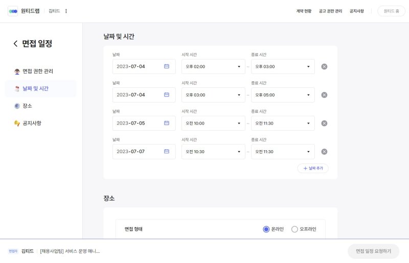 면접 일정 스케줄링 기능은 채용 담당자가 지원자에게 직접 연락할 필요 없이 원티드 채용 솔루션에서 면접 일정 제안부터 조율까지 한 번에 진행할 수 있는 것이 특징이다.