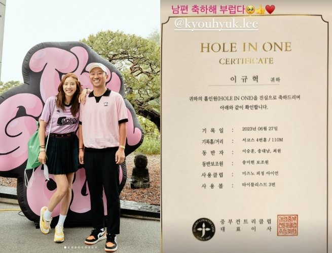 손담비는 27일 인스타그램에 "남편 축하해 부럽다"라고 적으며 이규혁이 받은 홀인원 확인증을 게재했다. 이어 "우리 오빠 홀인원 대박"이라는 문구와 함께 이규혁이 골프를 치다 홀인원에 성공하는 영상도 올렸다. 손담비는 현재 발리에서 여행 중이다.