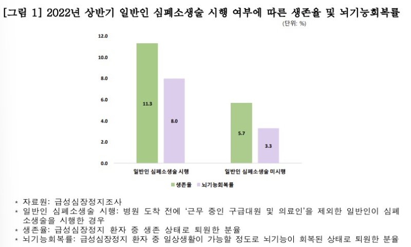 일반인이 심폐소생술을 시행한 경우 환자의 생존율은 11.3%(504명)로, 시행하지 않았을 경우의 생존율(5.7%)보다 2배 가까이 높았다. 또한 일반인이 심폐소생술이 시행한 환자 중 뇌기능을 회복한 사람은 357명(8.0%), 시행하지 않았을 경우(57명)보다 6배 이상 높았다.