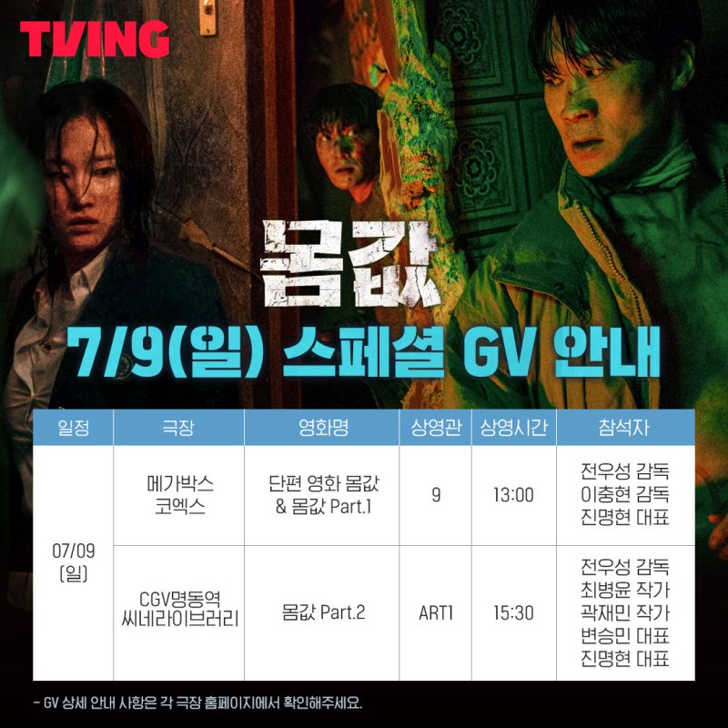 오는 9일 메가박스 코엑스 컴포트 9관에서는 '몸값X몸값 감독 대담'을 주제로 GV가 마련된다. 티빙 오리지널 시리즈 '몸값'을 연출한 전우성 감독과 원작 단편영화 '몸값'의 이충현 감독이 무브먼트 진명현 대표의 진행 아래 각자만의 색깔로 탄생한 '몸값'에 대한 이야기를 나눈다.