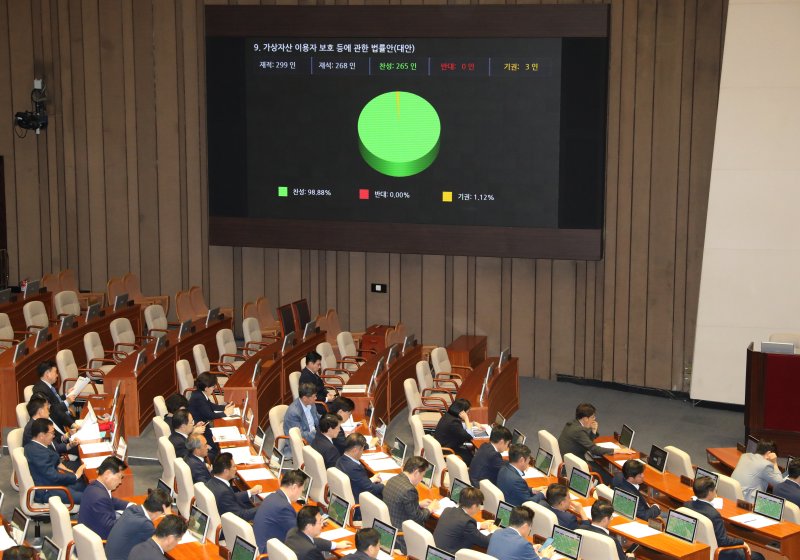 지난달 30일 여야는 오후 2시 국회에서 본회의를 열고 가상자산 이용자보호법을 상정해 재석 268인중 찬성 265인 기권 3인으로 의결했다.