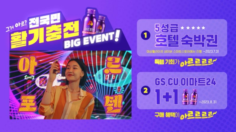 오프라인에서는 8월31일까지 시원한 가격 이벤트를 진행한다. GS25∙CU∙이마트24 등 가까운 편의점 3사에서 에너지샷 아르포텐을 1개 구매 시 1개를 추가 증정한다.