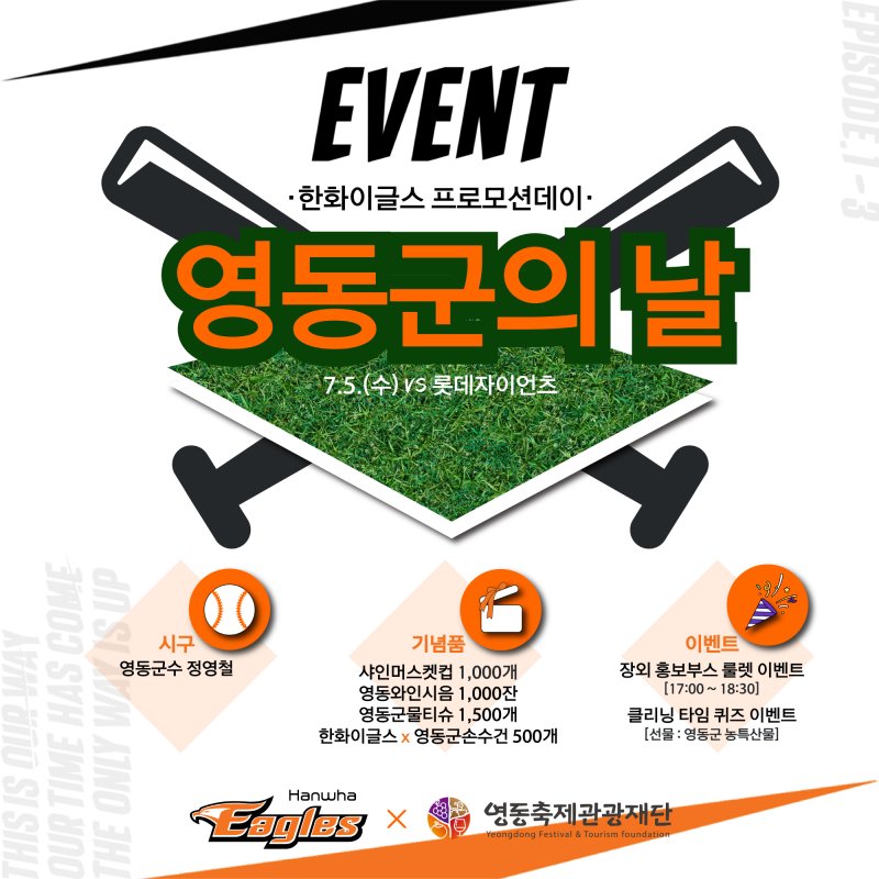 3일 영동군과 영동축제관광재단에 따르면 오는 5일 대전 한화생명이글스파크에서 야구관람객과 전국 TV 시청자들에게 영동을 알린다.