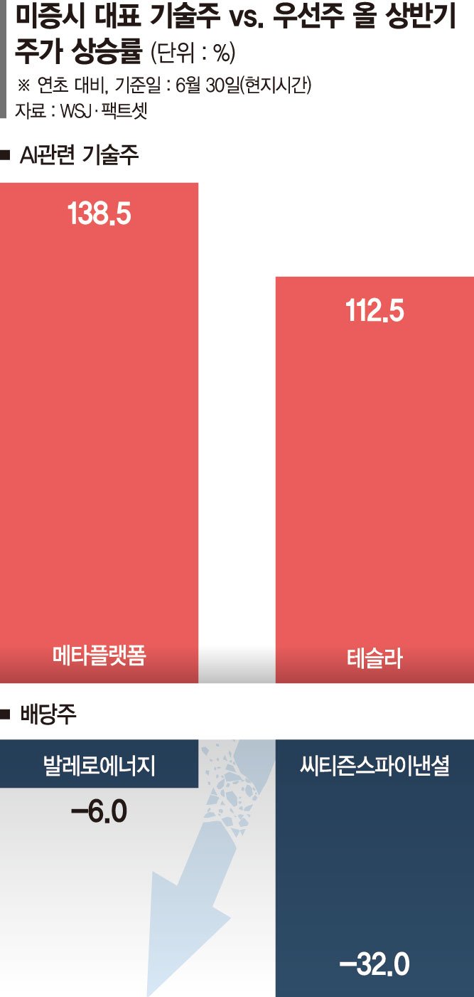 하지만 올해 투자자들의 분위기가 달라졌다. 투자자들은 배당주 대신, 성장주(기술주)를 더 주목하고 있다. AI로 기술주가 더 큰 수익을 가져다줄 것이라고 믿고 있어서다. 일부 기술주도 배당금을 지급한다. 다만, AI의 최대 수혜주로 꼽히는 엔비디아의 배당수익률은 0.04%이고, 애플은 0.5%, 브로드컴은 2.2% 수준에 불과하다.