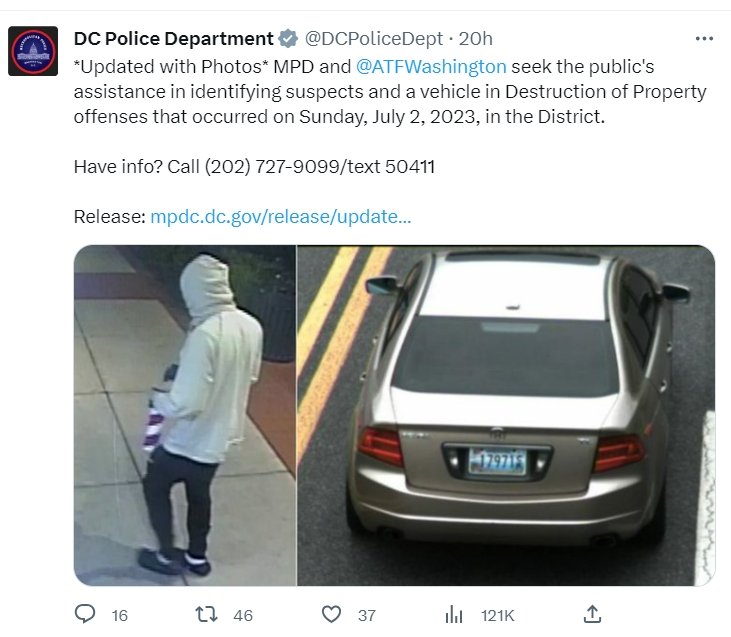 3일(현지시간) 워싱턴DC 경찰국에 따르면, 메트로폴리탄 경찰국 형사부와 연방 주류·담배·화기·폭발물단속국(ATF) 워싱턴 지부가 지난 2일 도심에서 발생한 폭발 사건과 관련해 용의자를 추적하고 있다.