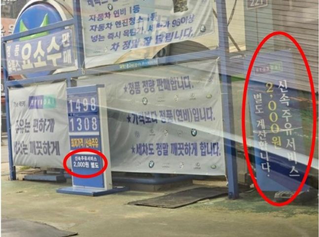 그가 공개한 주유소 사진에는 ‘신속주유서비스 2000원 별도 계산합니다’, ‘신속주유서비스 2000원 별도’라는 문구가 여러 곳에 안내 돼 있다.