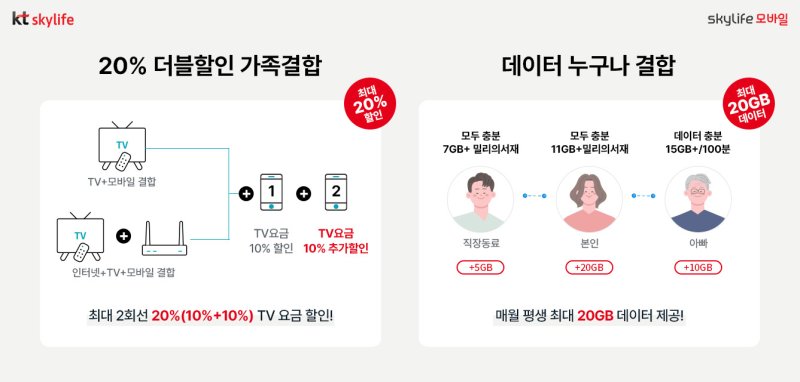 이외에도 스카이라이프 모바일을 이용하는 가족, 친구, 연인, 지인 누구라도 모바일 요금제끼리 결합하면 회선 수 관계없이 매월 최대 20GB의 데이터를 보너스로 제공하는 '데이터 누구나 결합'도 출시됐다.