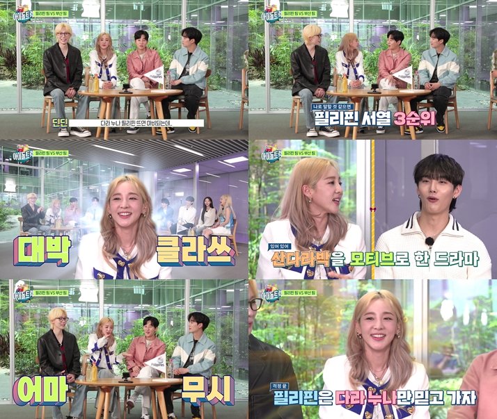 이에 산다라박은 "필리핀 서열 3순위다. 두테르테, 파퀴아오, 나다"라고 너스레를 떤다. "위인전도 있냐"라는 질문에는 "나를 모티브로 한 드라마는 나왔다. 나를 주인공으로 해서 내 히스토리를 다룬…"이라고 소개해 감탄을 끌어낸다.