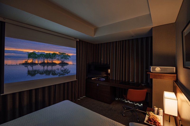 LG전자의 초고해상도 프로젝터 '시네빔 레이저 4K HU710PW'가 설치된 슈페리어 코너 객실 1박과 영화와 함께 즐길 수 있는 치맥 세트, 스낵 이용 혜택이 포함된다.