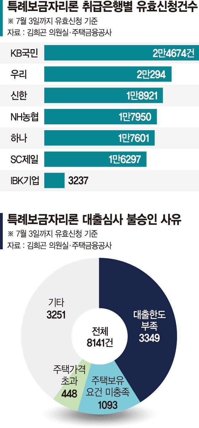 요건을 충족하지 못해 대출 승인을 받지 못한 경우는 지난 3일까지 총 8141건으로 집계됐다. '대출한도 부족'이 3349건으로 가장 많았고 '주택보유수 요건 미충족'이 1093건, '주택가격 초과'가 448건이었다.