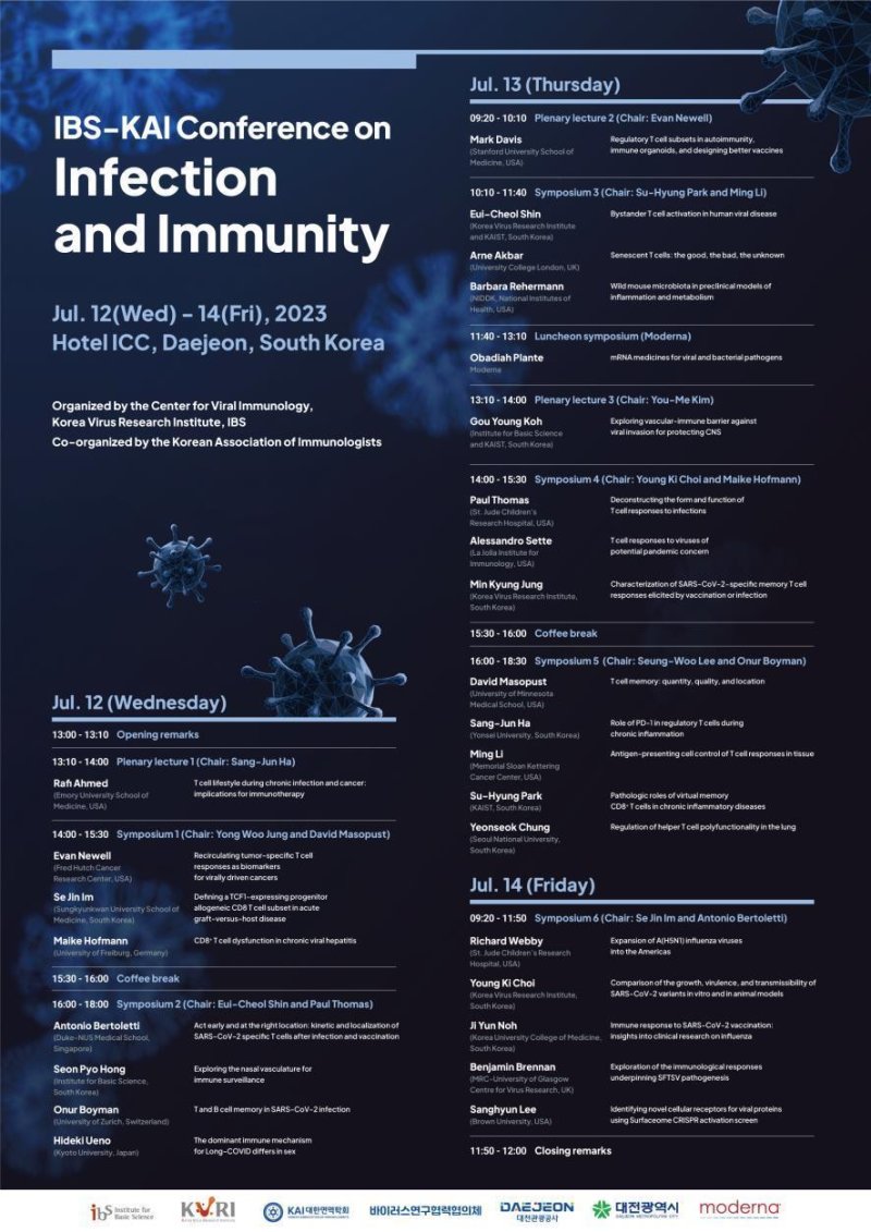 IBS에 따르면 라피 아메드 미국 에모리 대학 교수, 마크 데이비스 미국 스탠포드 대학 교수 등 미국 국립과학아카데미 회원 석학들을 비롯, 고규영 IBS 혈관연구단 단장 등 바이러스 면역학 분야 국내·외 석학 20여 명이 이번 콘퍼런스에서 연사로 참가한다.