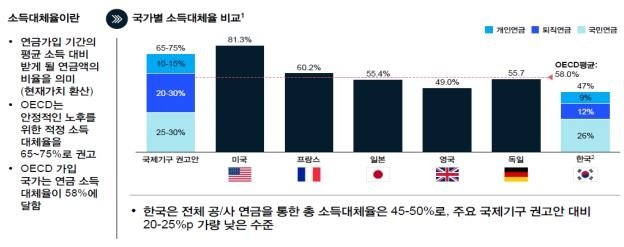 맥킨지 한국사무소가 이를 기반으로 공적·사적 연금을 합쳐 연금 소득대체율(연금가입 기간의 평균 소득 대비 받게 될 연금액의 비율)을 국가별로 비교, 분석한 결과 우리나라 소득대체율은 약 47%로 추산됐다.