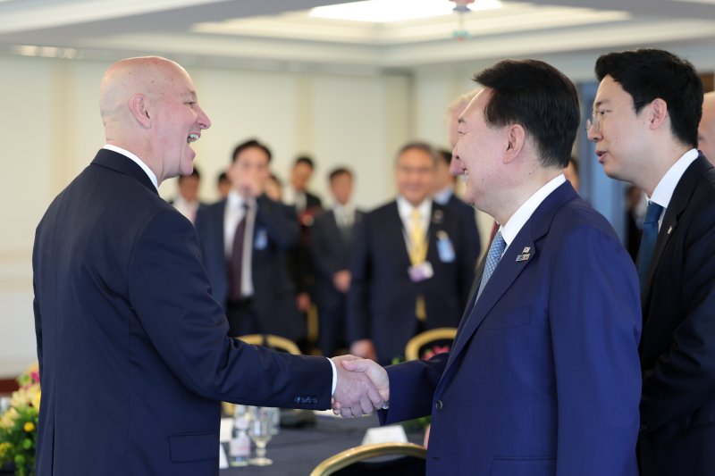 윤 대통령은 이날 행사장에 입장하면서 미국 상원의원 대표단 6명과 일일이 악수하면서 환영과 감사 인사를 전했고, 참석자들은 윤 대통령이 미국 국빈만찬에서 부른 '아메리칸 파이'를 다시 언급하면서 대화를 나누기도 했다.