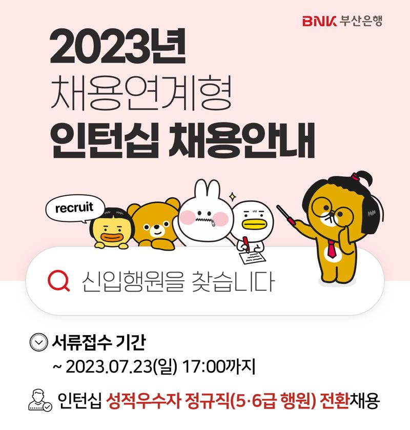 인턴십 과정 후 종합평가 및 면접을 거쳐 성적우수자는 최종적으로 정규직 5·6급 행원으로 전환해 부산은행 하반기 5·6급 신입행원 정기 공채를 대체할 계획이다.