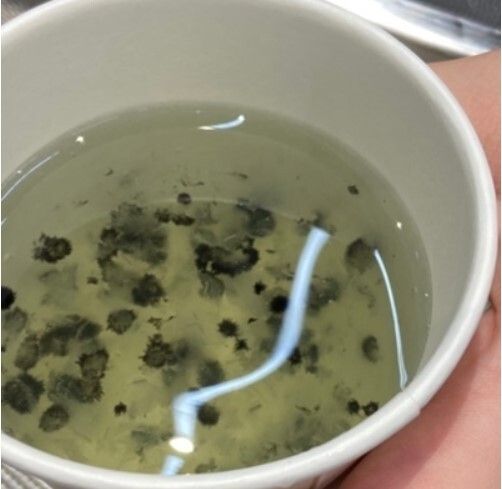 A씨의 아들과 여자친구가 방문한 미용실에서 받았다는 음료에는 정체를 알 수 없는 검정색 이물질이 둥둥 떠있다. A씨는 해당 물질을 곰팡이라 추정했다.