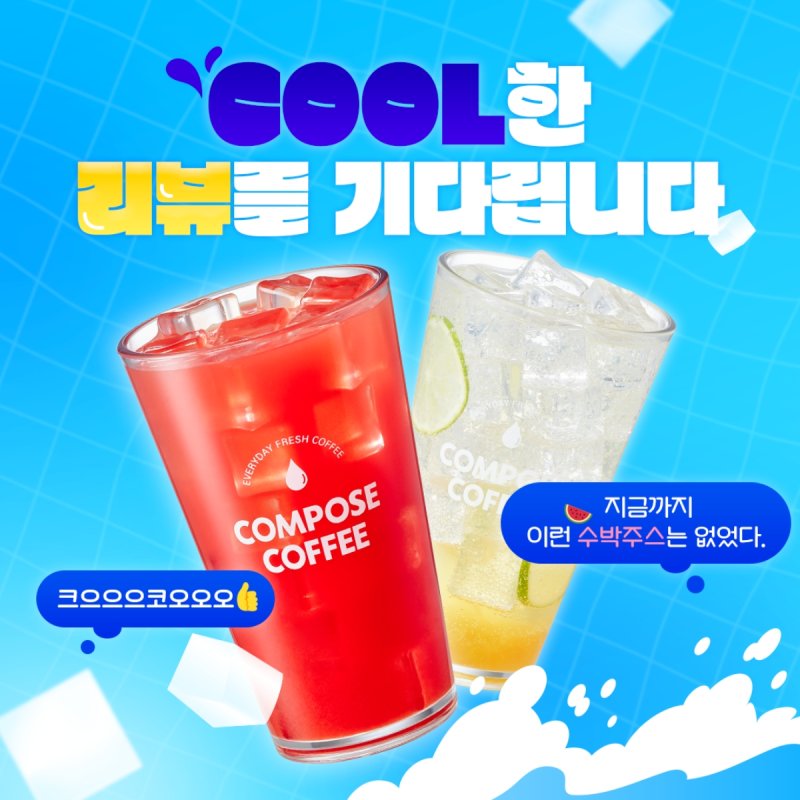 컴포즈커피는 여름 신메뉴 2종 출시와 함께 무더위와 장마로 지친 소비자들을 응원하는 마음을 담아 이번 깜짝 이벤트를 준비했다. 이달 1일 출시된 신메뉴 2종 ▲국내산 수박주스와 ▲라임애플 스파클링은 시원하고 달콤한 과일이 사용된 것이 특징이다.