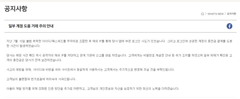 고객에겐 비밀번호 재설정 안내 등 추가 조치를 했다. 일부 피해가 확인된 고객의 충전금은 회사 차원에서 전액 보전했다.