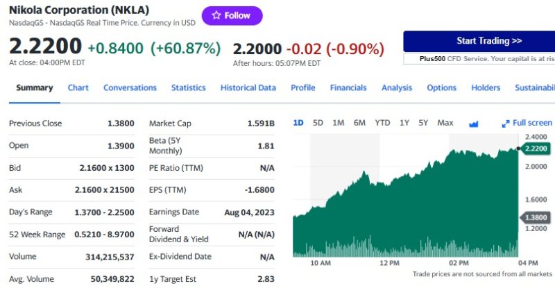 13일(현지시간) 뉴욕증시에서 니콜라는 전거래일보다 60.87% 폭등한 2.22 달러를 기록했다.