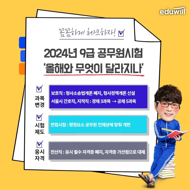 에듀윌의 공무원 합격전략연구소는 9급 국가직·지방직 공무원 시험에서 2024년부터 달라지는 사항을 14일 밝혔다.