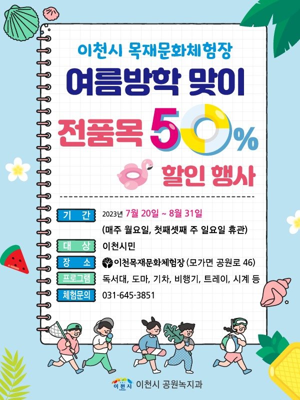 (이천=뉴스1) 김평석 기자 = 경기 이천시가 여름방학을 맞아 오는 20일부터 8월 31일까지 모가면 목재문화체험장 전 제품을 50% 할인 판매한다.