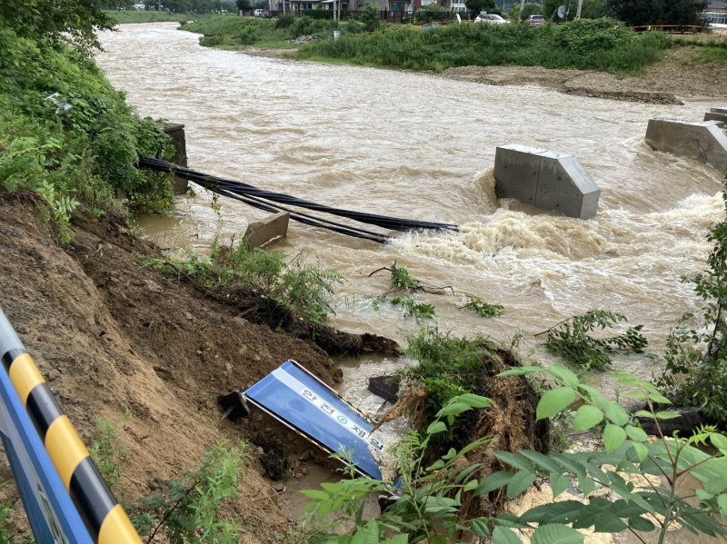 15일 오후 2시께 천안 목천읍 산방천의 물이 불어나면서 동리교 인근 하천 제방이 유실됐다. 이로 인해 하천 옆 도로 100m 구간이 통제됐다.