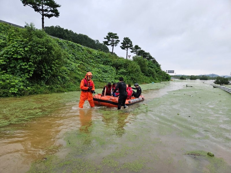 (부여=뉴스1) 김낙희 기자 = 호우경보가 내려진 충남 부여군 부여읍의 물에 잠긴 마을에서 주민 21명이 고립됐다가 안전하게 구조됐다.