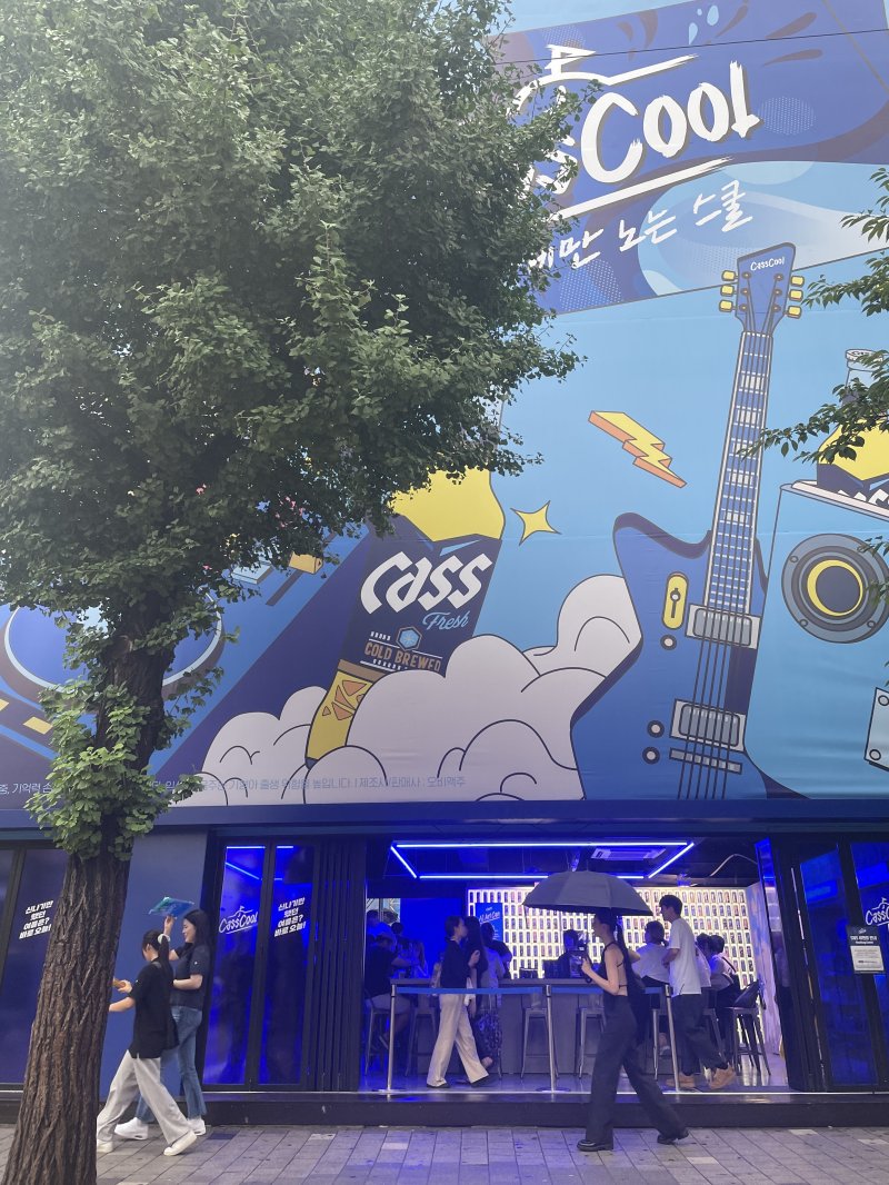 18일 서울시 마포구에 따르면 오비맥주는 지난달 홍대 상상마당 인근 '카스쿨'(Cass Cool) 팝업스토어(반짝매장)를 오픈하며 대형 현수막을 걸고 홍보에 나섰다.