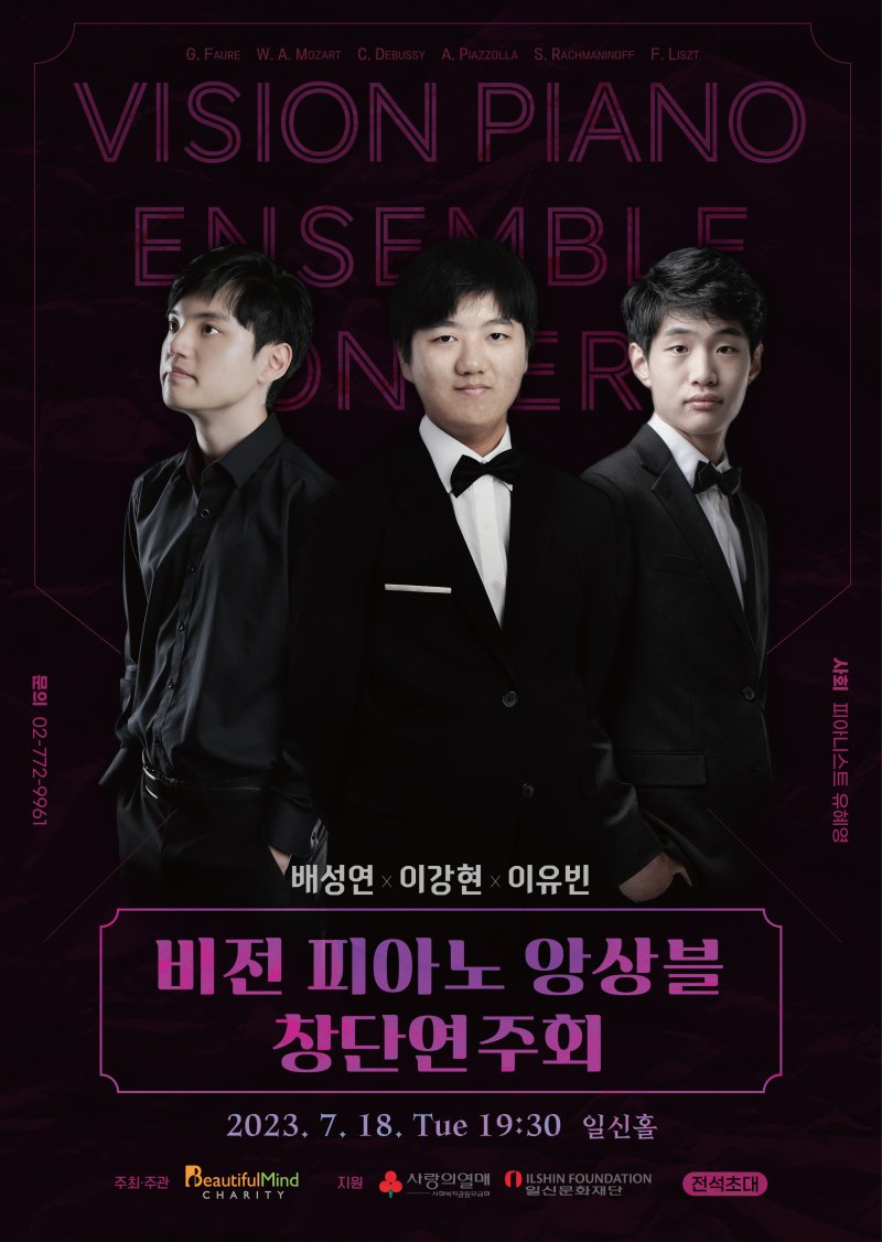 사단법인 뷰티플마인드는 '비전 피아노 앙상블' 창단 연주회를 18일 오후 7시 30분 일신홀에서 선보인다고 밝혔다.