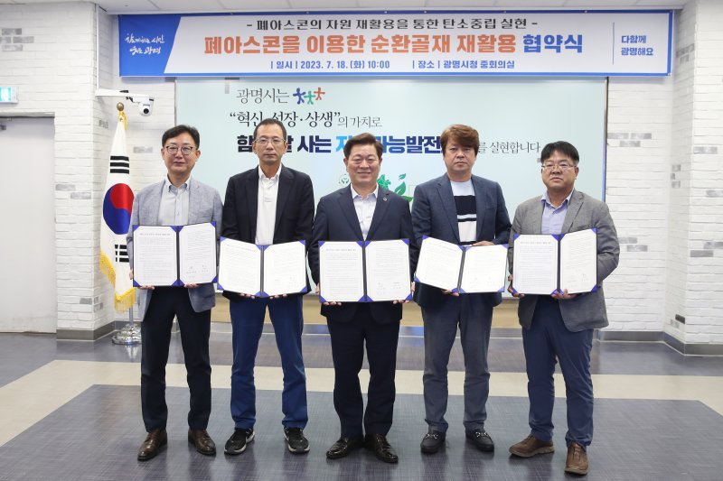 (광명=뉴스1) 유재규 기자 = 경기 광명시가 도로 보수와 재포장 과정에서 발생하는 폐아스콘을 전량 재활용한다고 18일 밝혔다. 시는 이날 폐아스콘 재활용제품 생산업체 4곳과 '순환골재 재활용 협약'을 체결했다.