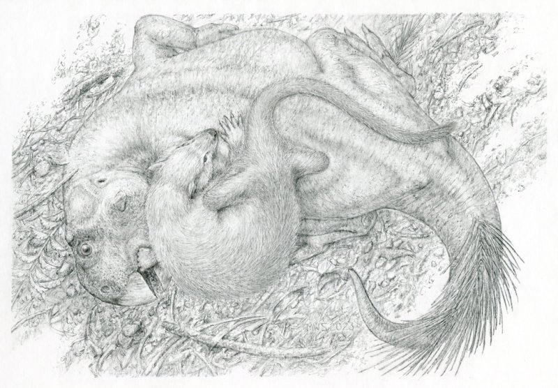 (서울=연합뉴스) 이주영 기자 = 1억3천만년 전 백악기에 몸집 큰 공룡들의 먹잇감으로만 여겨지던 작은 포유동물이 자기보다 큰 초식 공룡을 사냥하는 모습을 생생하게 보여주는 화석이 중국에서 발견됐다.