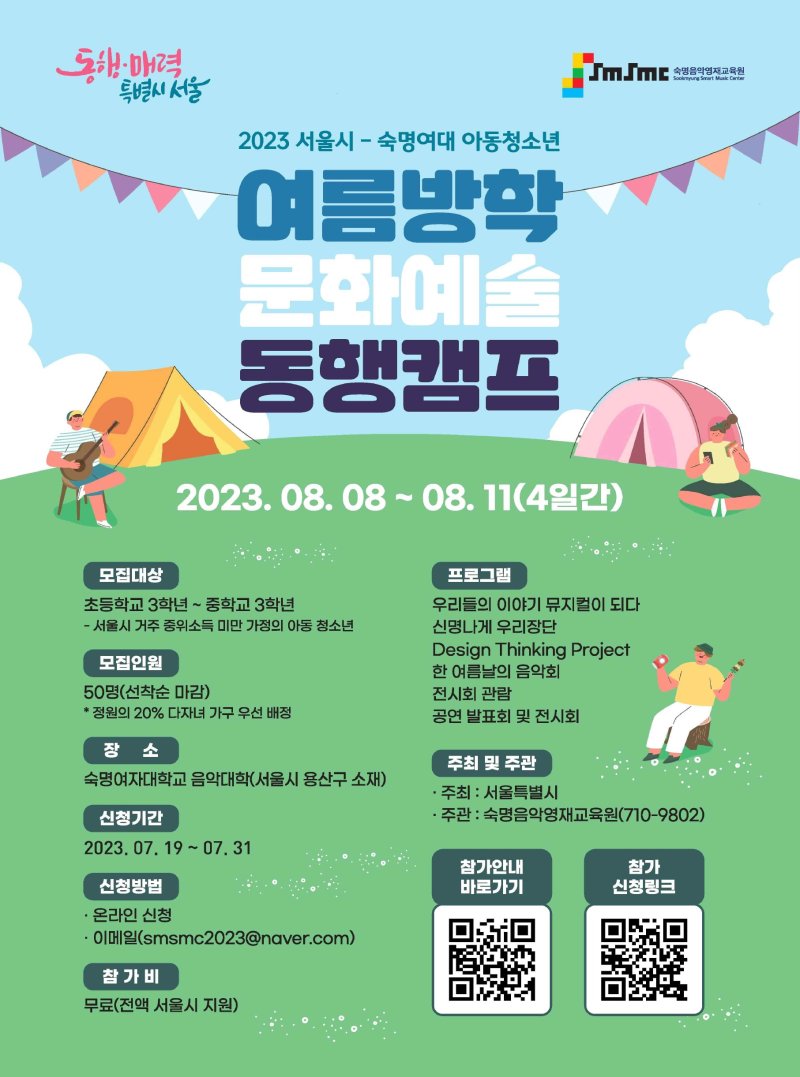 숙명여자대학교 캠프는 50명을 모집하며 8월8일부터 8월11일까지 4일간 무박으로 진행된다. 연령별로 반을 편성해, 개회식을 시작으로 △사물놀이 △뮤지컬 △국악 장단 △여름날의 음악회 △전시회 체험학습 등으로 구성됐다.