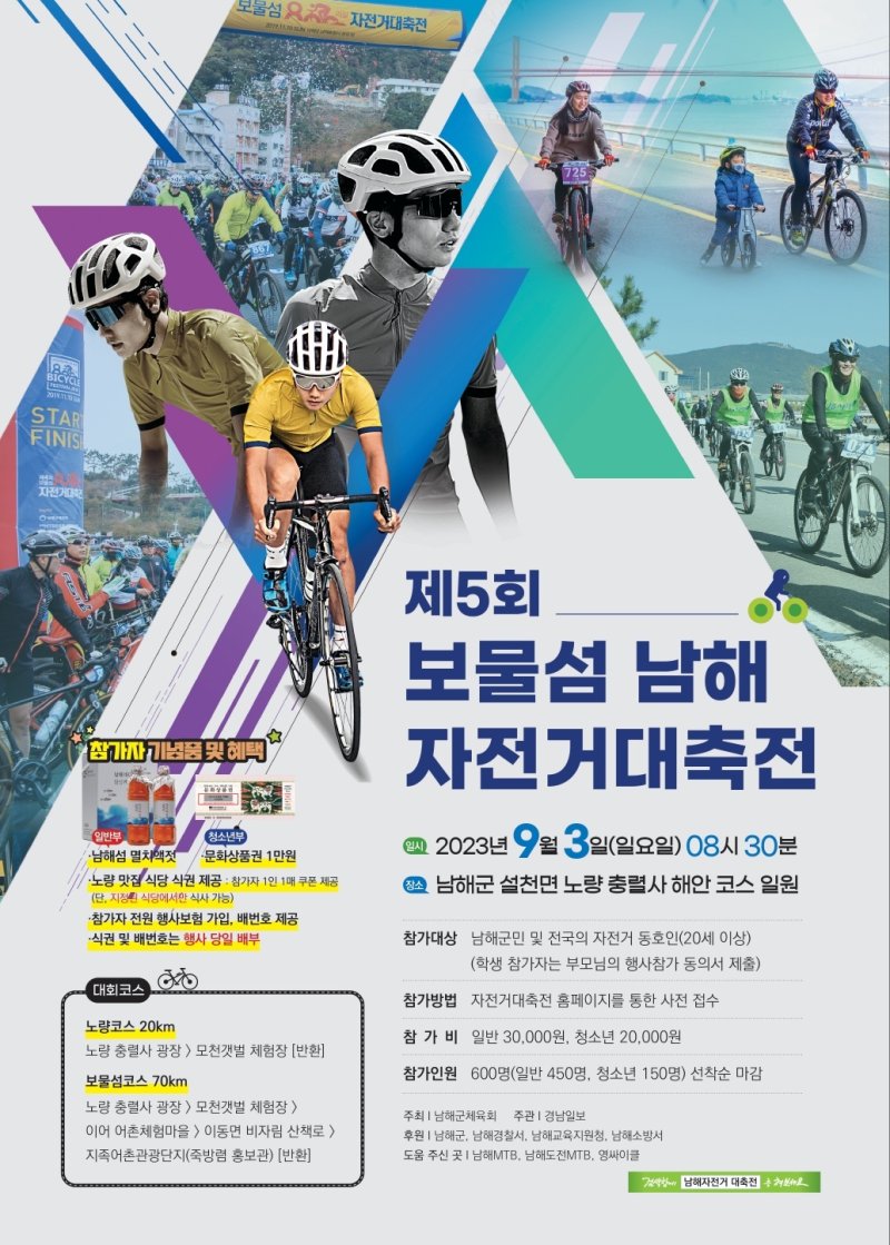 대회 참가를 희망하는 사람은 내달 13일까지 never ‘남해자전거대축전’ 홈페이지를 통해 신청하면 된다. 일반부 참가자는 남해섬 멸치액젓 세트(900ml 2병)와 식권, 청소년부는 문화상품권(1만원권)과 식권을 행사 당일 배부한다.