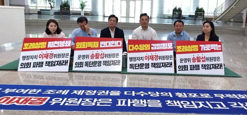 앞서 지난 17일부터 이날까지 열린 시의회 운영위원회와 행정자치위원회에서 민주당 발의 조례안 4건 모두 국힘소속인 두 위원장이 의안으로 상정하지 않는데 따른 농성이다.
