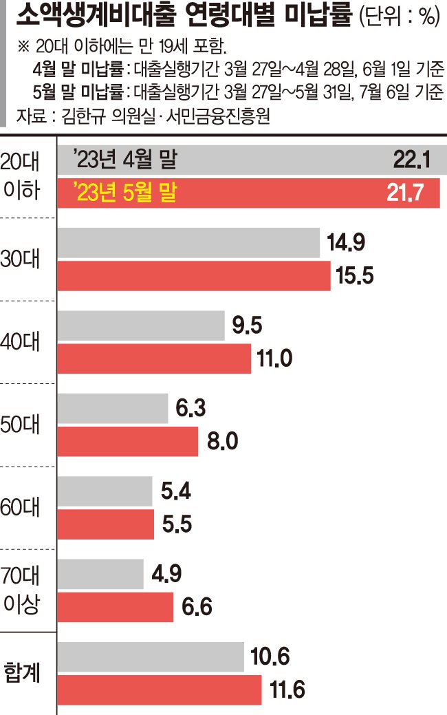 하지만 연령별로 나눠보면 2030세대의 미납률이 평균치를 크게 웃돌았다. 만 19~29세 미납률은 4월 말 22.1%, 5월 말 21.7%로 월평균(11.6%, 10.6%)의 2배가량이었다. 30대 미납률 또한 4월 말 14.9%, 5월 말 15.5%로 모두 평균을 웃돌았다. 5060세대의 미납률이 5.4~8.0%인 것과 비교하면 최대 4배나 높다.