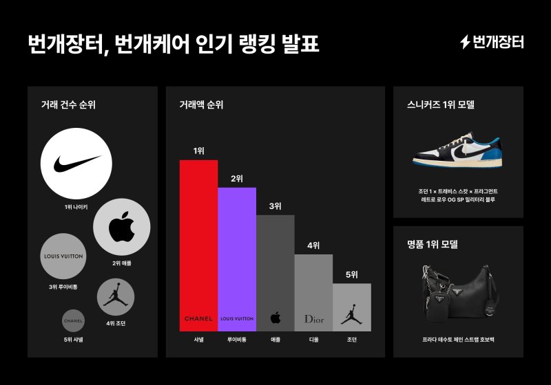 번개장터는 26일 중고거래 토털 케어 서비스 '번개케어' 이용자 데이터를 기반으로 출시 후 7개월간 거래 브랜드 인기 순위를 발표했다.