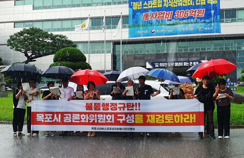 목포시내버스 공공성강화 범시민대책위는 26일 오후 목포시청 앞에서 기자회견을 갖고 "목포시의 공론화위원회 위원 선정은 불통행정의 전형"이라고 강조했다.