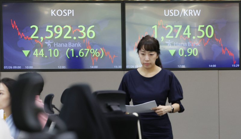 26일 한국거래소에 따르면 코스피지수는 전날 대비 1.67% 하락한 2592.36으로 장을 마감했다. 이달 14일부터 2600선을 지키던 코스피는 9거래일 만에 2500선으로 후퇴했다.