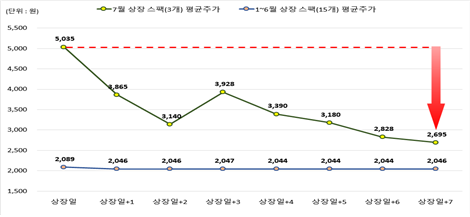 실제 올해 7월까지 신규 상장한 스팩은 총 18개(코스닥시장)이며, 이 가운데 이달 증시에 오른 3개가 상장일 주가가 튀었다. 공모가 대비 평균 151.8%가 올랐다. 지난 1~6월 중 상장한 15개 스팩 수치(4.5%)와는 차이가 크다. 이후 해당 3개 종목은 상장 7일 후 상장일 대비 주가가 평균 46.5% 주저앉았다.