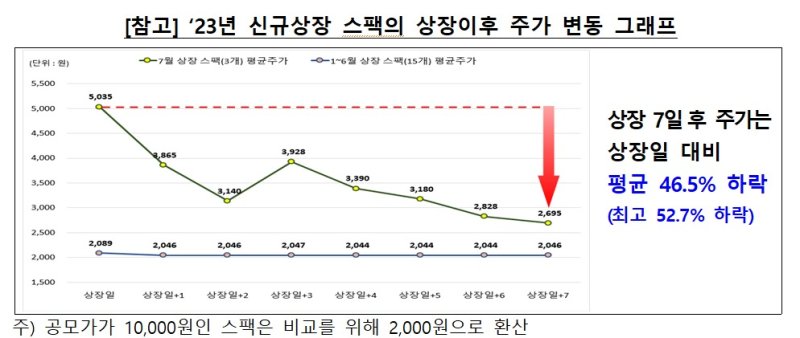 금감원은 "스팩은 '상대적으로 위험성이 낮다'는 통념과 달리, 공모가 대비 주가가 높은 스팩에 투자할 경우 손실 발생 가능성이 크므로 각별한 주의가 필요하다"고 말했다.