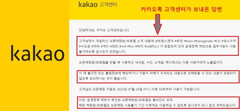 성소수자를 지칭하는 용어가 공서양속에 해가 된다는 카카오 측의 입장에 대해 A씨는 "카카오톡이 정의하는 공서양속이 도대체 무엇이냐" "모든 시민의 인권은 존중받아야 한다. 카카오톡은 성소수자 차별 및 혐오 행위에 대해 진심으로 사과하고 책임을 져라"고 주장했다.